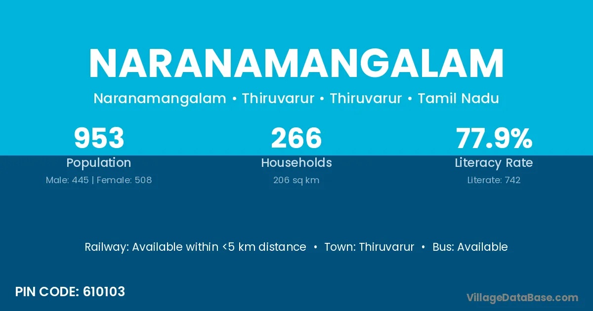 Naranamangalam village has a total population of 1,377 people, of which 688 are males and 689 are females.