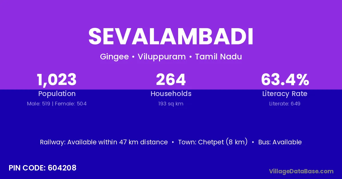 Sevalambadi village has a total population of 1,023 people, of which 519 are males and 504 are females.