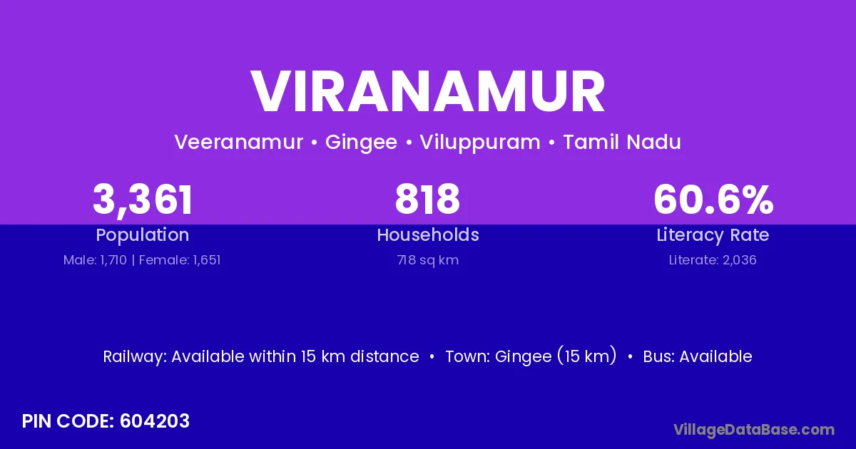 Gingee (15 km) is the nearest town to Viranamur village for major economic activities and is located approximately 15 km away.