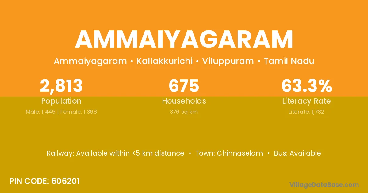 Ammaiyagaram village has a total population of 2,813 people, of which 1,445 are males and 1,368 are females.