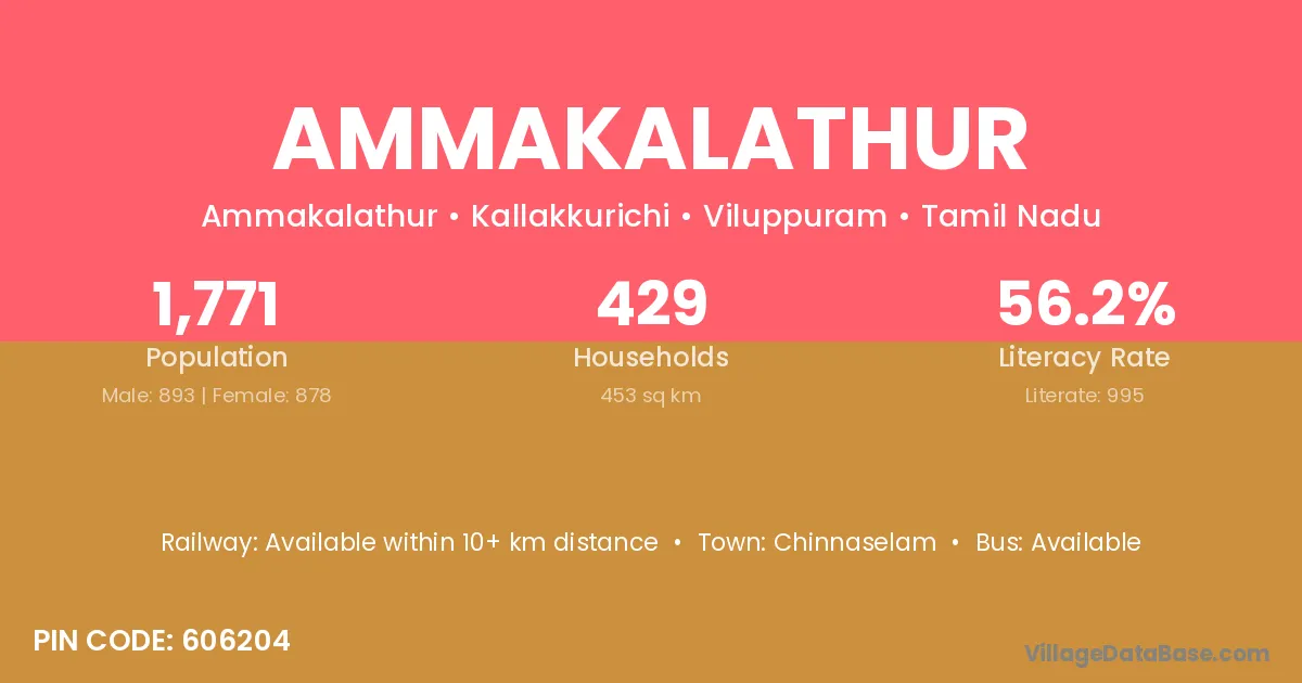 Ammakalathur village has a total population of 1,771 people, of which 893 are males and 878 are females.