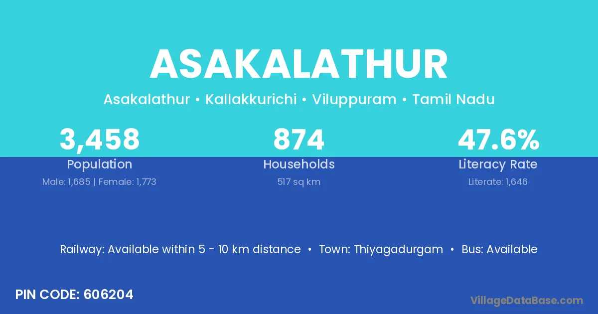 According to Census 2011 information, the village code of Asakalathur village is 606204.