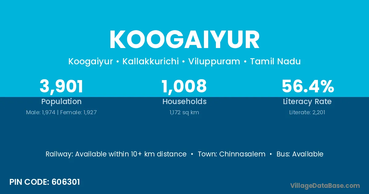 Koogaiyur village has a total population of 3,901 people, of which 1,974 are males and 1,927 are females.