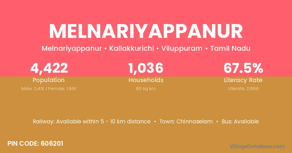 According to Census 2011 information, the village code of Melnariyappanur village is 606201.