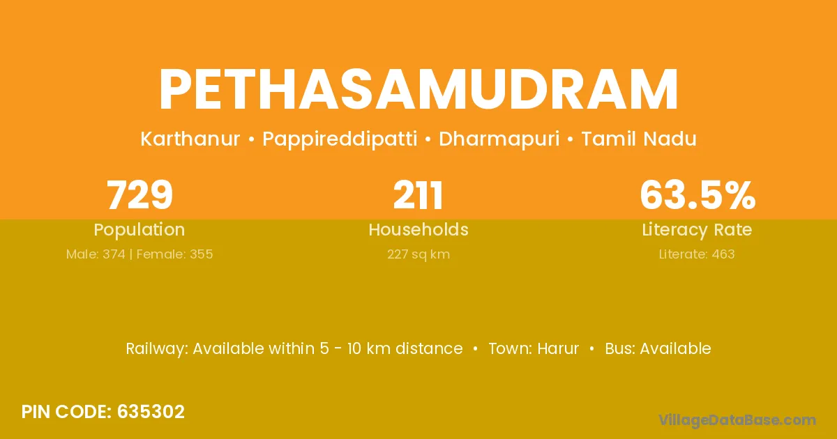 Pethasamudram village has a total population of 1,823 people, of which 906 are males and 917 are females.
