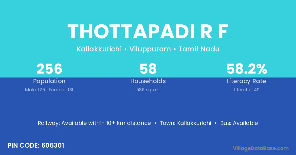 Thottapadi R F village has a total population of 256 people, of which 125 are males and 131 are females.
