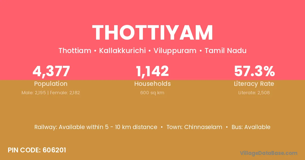 Thottiyam village has a total population of 4,377 people, of which 2,195 are males and 2,182 are females.
