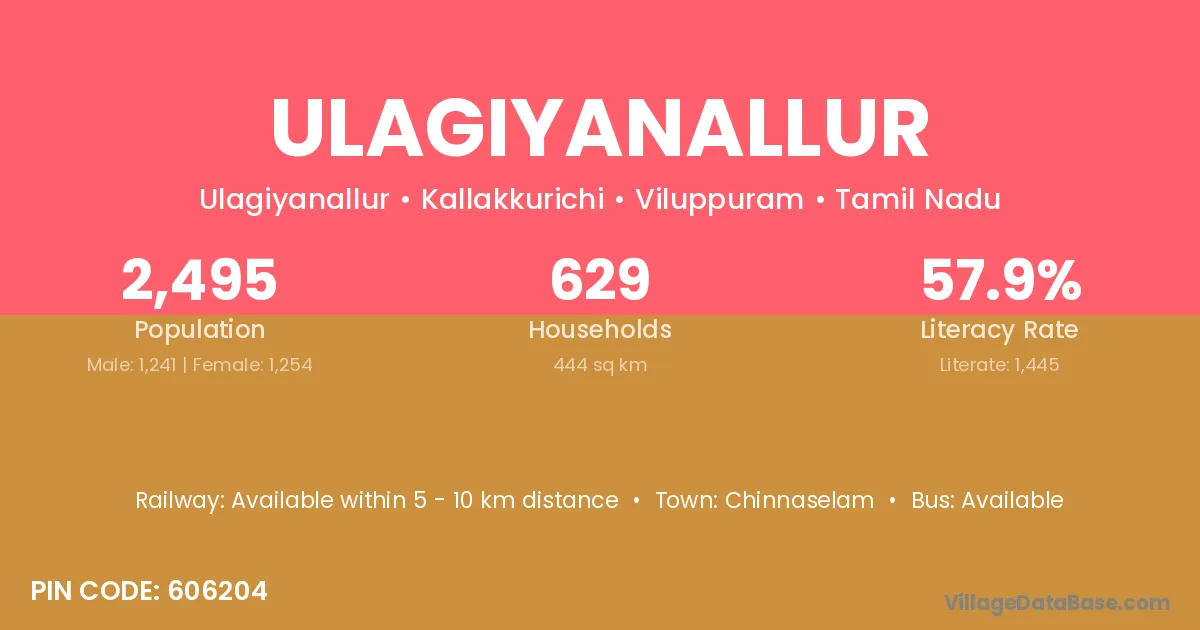 Ulagiyanallur village has a total population of 2,495 people, of which 1,241 are males and 1,254 are females.