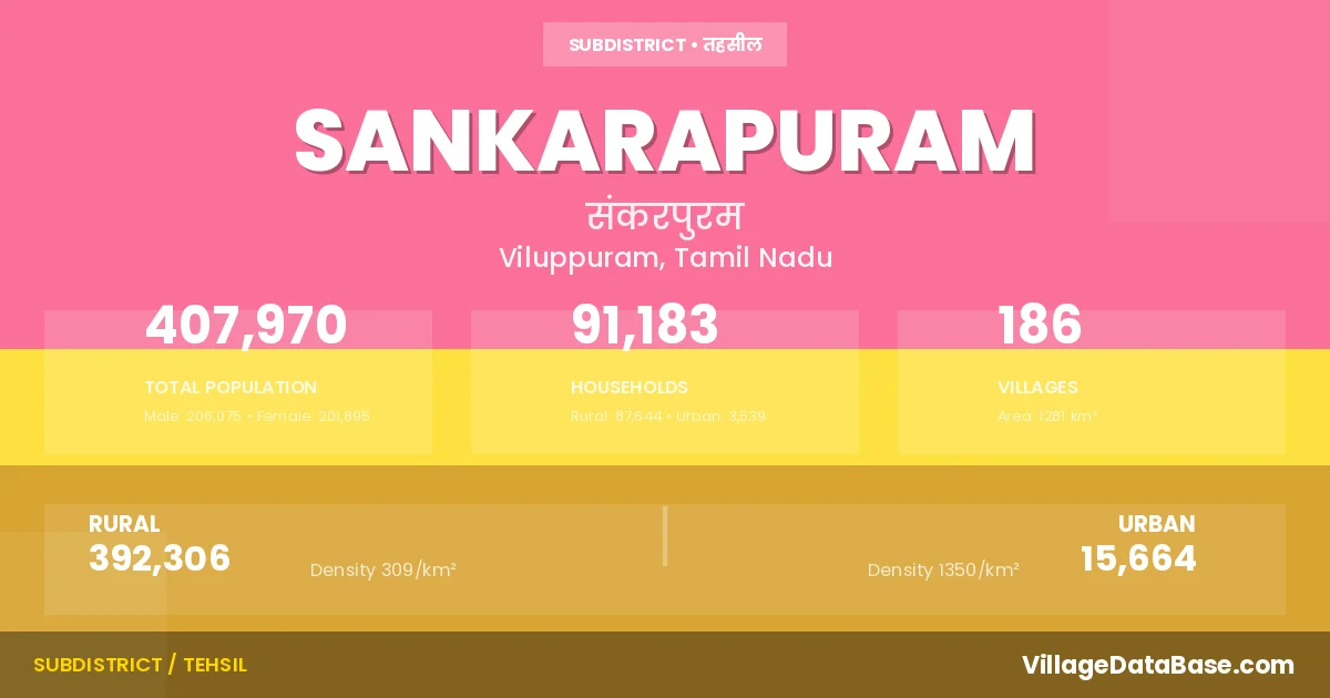 According to the 2011 census The total area of Sankarapuram Taluka is 1281 km², with a population of 407970 people. The population density is 318 inhabitants per square kilometre, and there are approximately 91183 houses in the sub district.