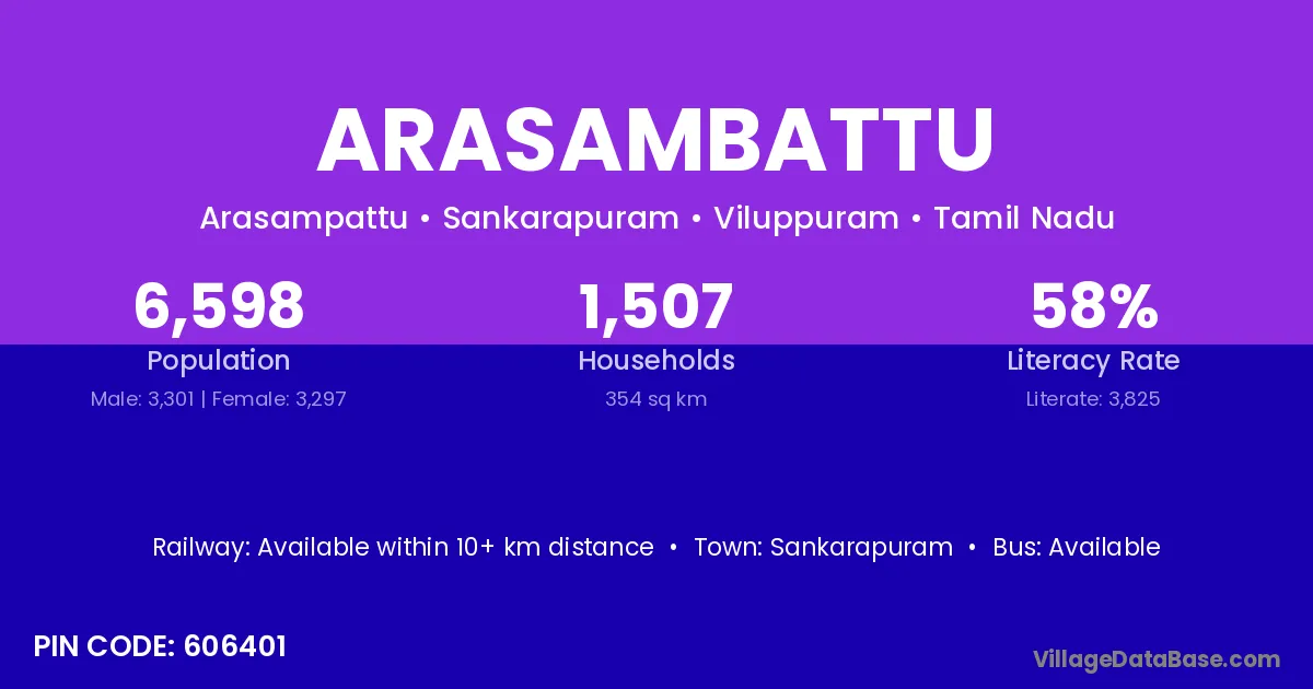 Arasambattu village has a total population of 6,598 people, of which 3,301 are males and 3,297 are females.