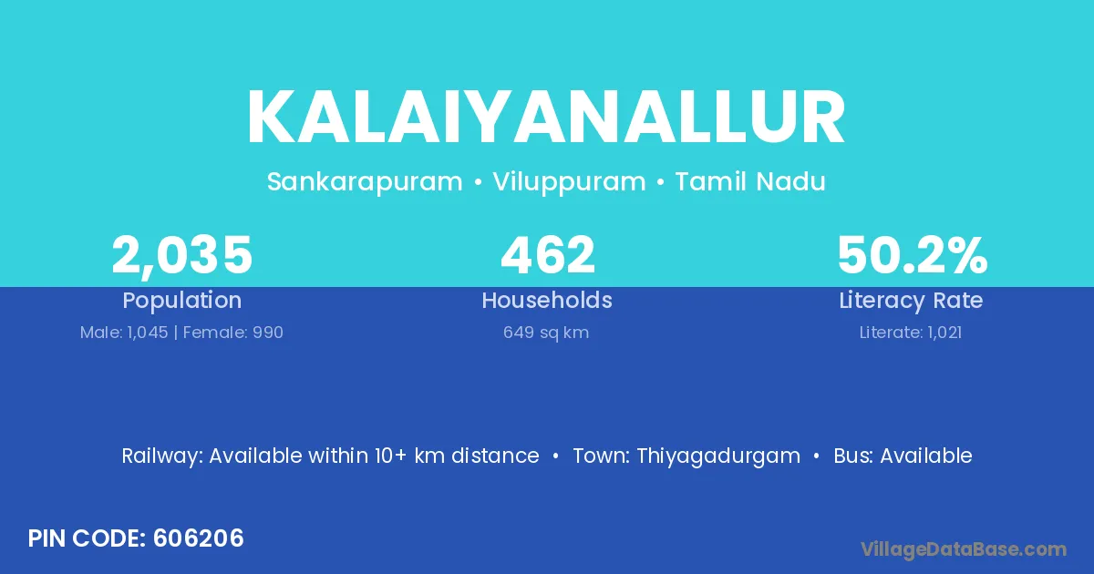 Kalaiyanallur village has a total population of 2,035 people, of which 1,045 are males and 990 are females.