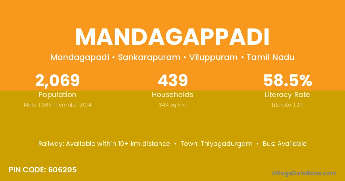 Mandagappadi village has a total population of 2,069 people, of which 1,065 are males and 1,004 are females.