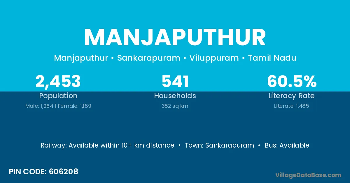 Manjaputhur village has a total population of 2,453 people, of which 1,264 are males and 1,189 are females.
