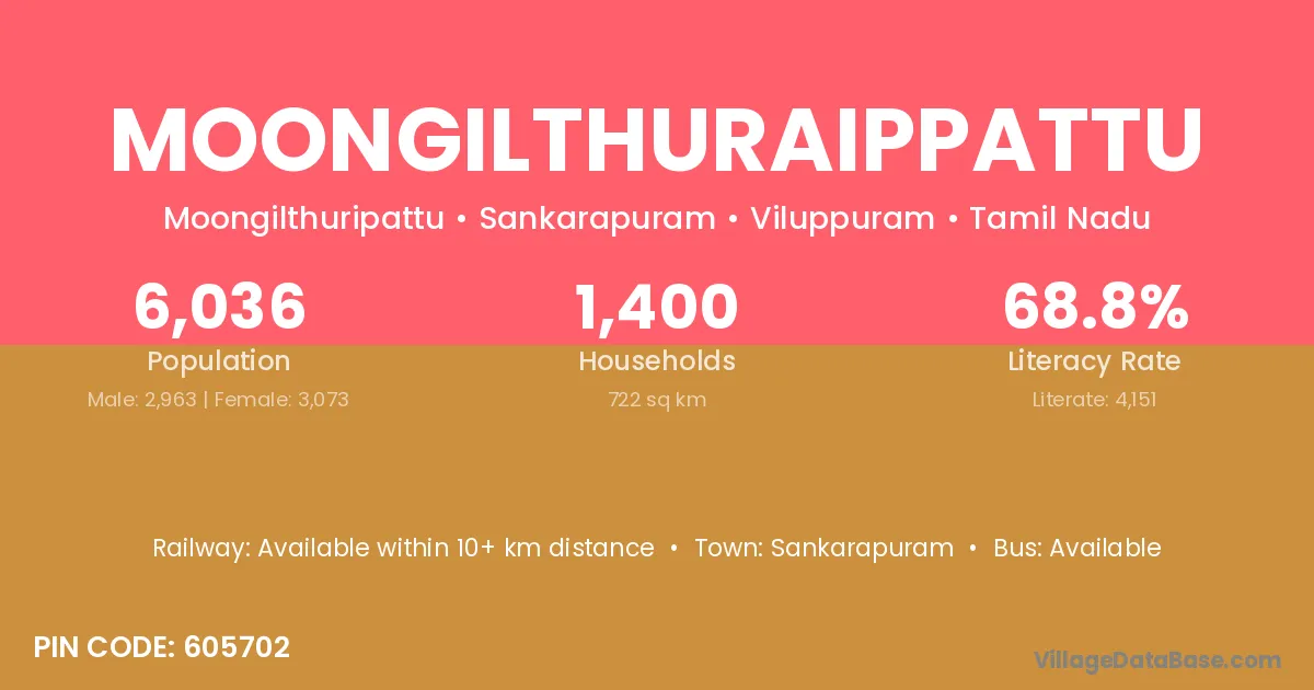 Moongilthuraippattu village has a total population of 6,036 people, of which 2,963 are males and 3,073 are females.