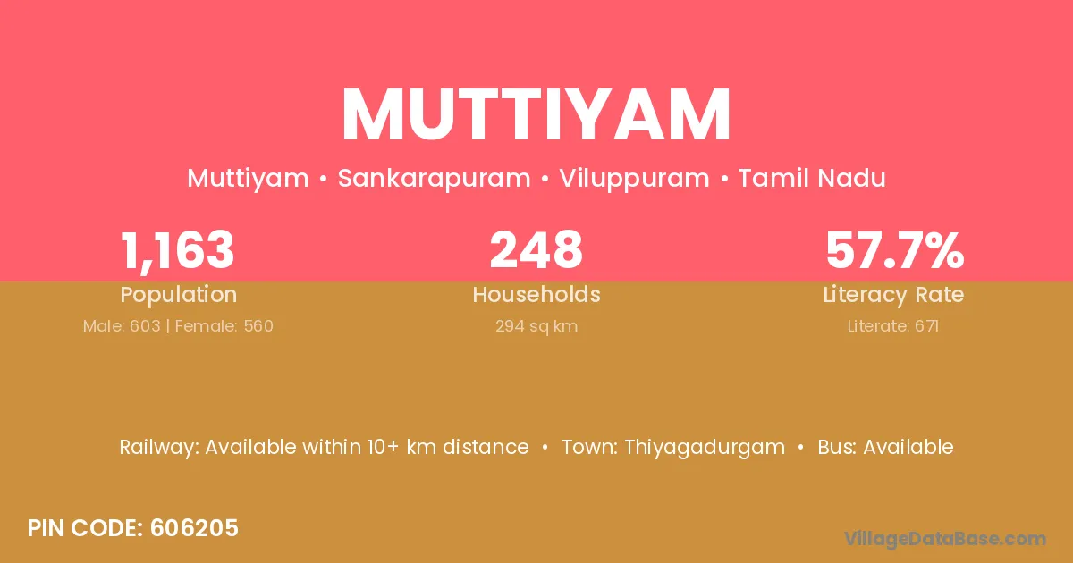 Muttiyam village has a total population of 1,163 people, of which 603 are males and 560 are females.