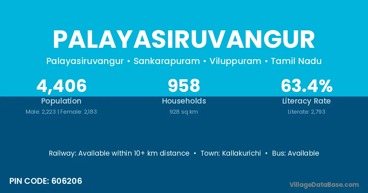 Kallakurichi is the nearest town to Palayasiruvangur village for major economic activities