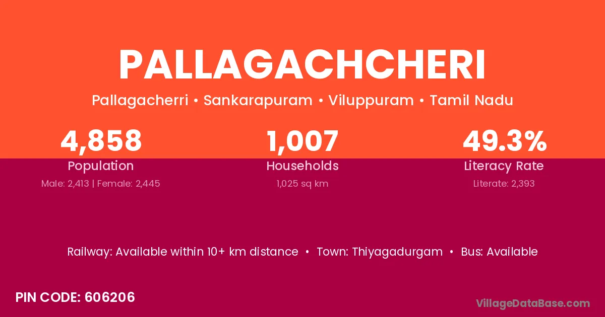 Pallagachcheri village has a total population of 4,858 people, of which 2,413 are males and 2,445 are females.