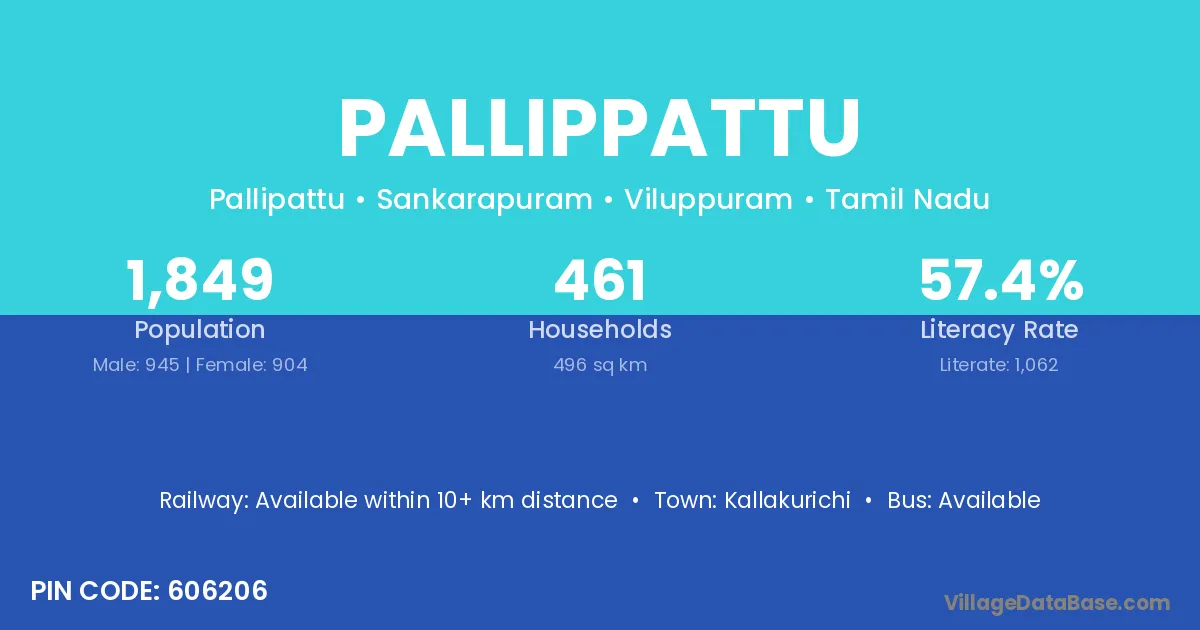 Pallippattu village has a total population of 1,849 people, of which 945 are males and 904 are females.