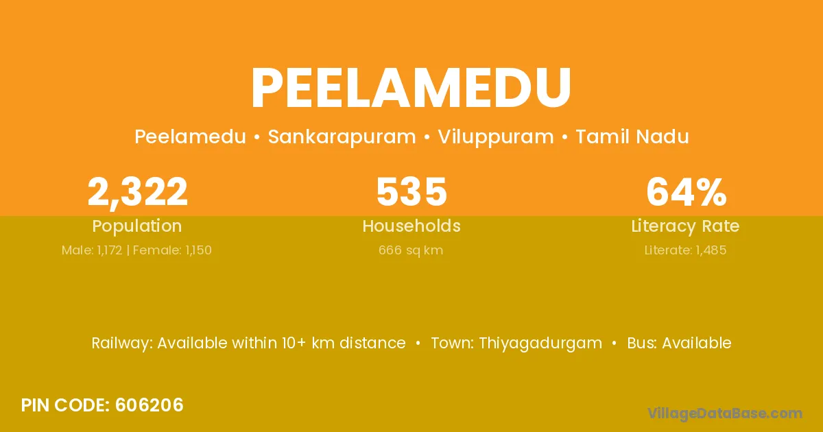 According to Census 2011 information, the village code of Peelamedu village is 606206.