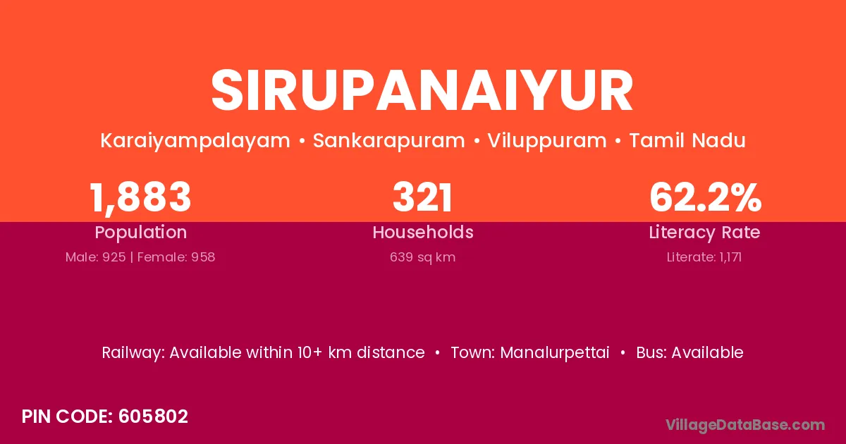 Sirupanaiyur village has a total population of 1,883 people, of which 925 are males and 958 are females.