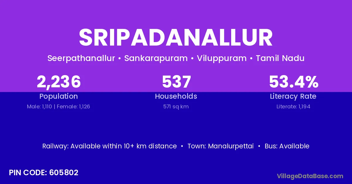Sripadanallur village has a total population of 2,236 people, of which 1,110 are males and 1,126 are females.
