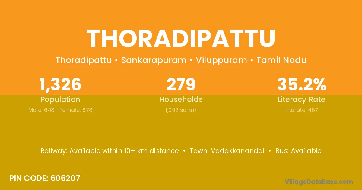 Thoradipattu village has a total population of 1,326 people, of which 648 are males and 678 are females.