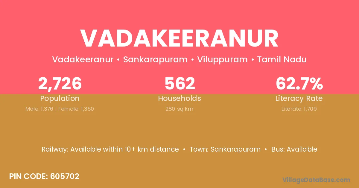 Vadakeeranur village has a total population of 2,726 people, of which 1,376 are males and 1,350 are females.