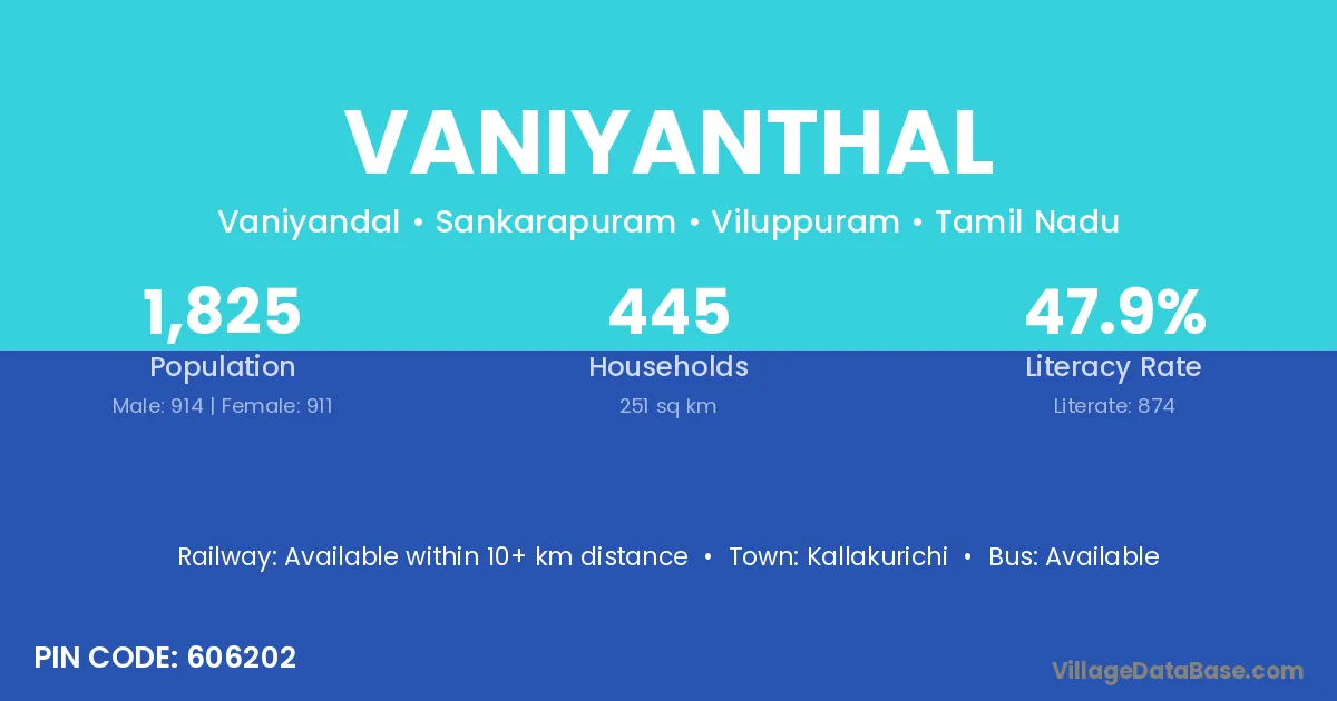 Vaniyanthal village has a total population of 1,825 people, of which 914 are males and 911 are females.
