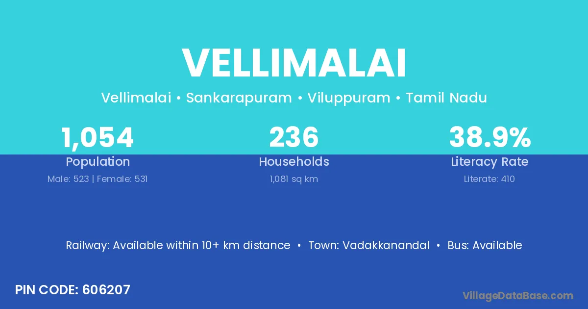 Vellimalai village has a total population of 1,054 people, of which 523 are males and 531 are females.