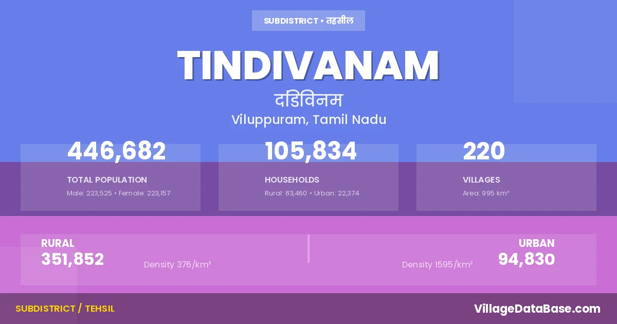 According to the 2011 census The total area of Tindivanam Taluka is 995 km², with a population of 446682 people. The population density is 449 inhabitants per square kilometre, and there are approximately 105834 houses in the sub district.