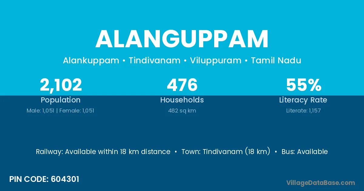 Tindivanam (18 km) is the nearest town to Alanguppam village for major economic activities and is located approximately 18 km away.