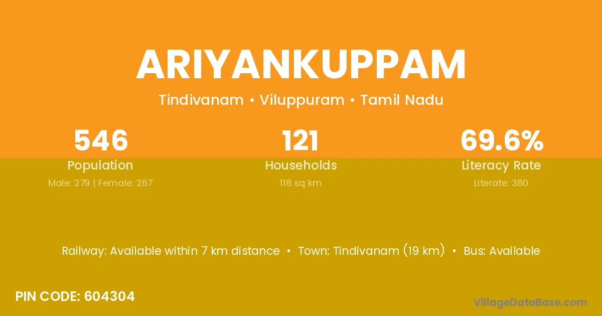 Tindivanam (19 km) is the nearest town to Ariyankuppam village for major economic activities and is located approximately 19 km away.