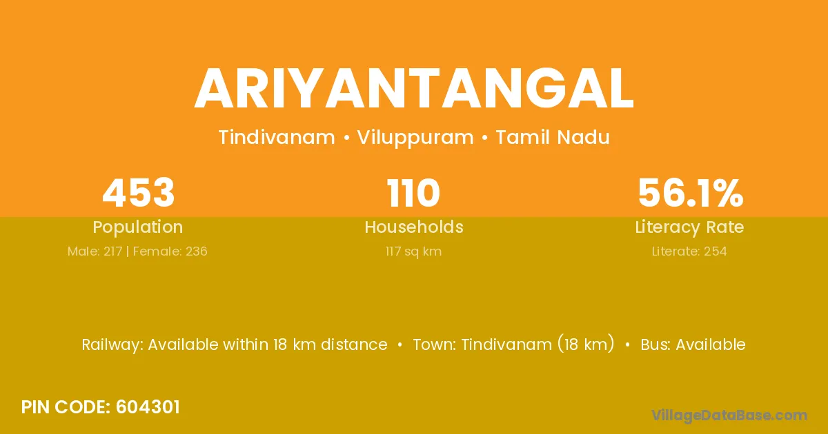 Ariyantangal village has a total population of 453 people, of which 217 are males and 236 are females.