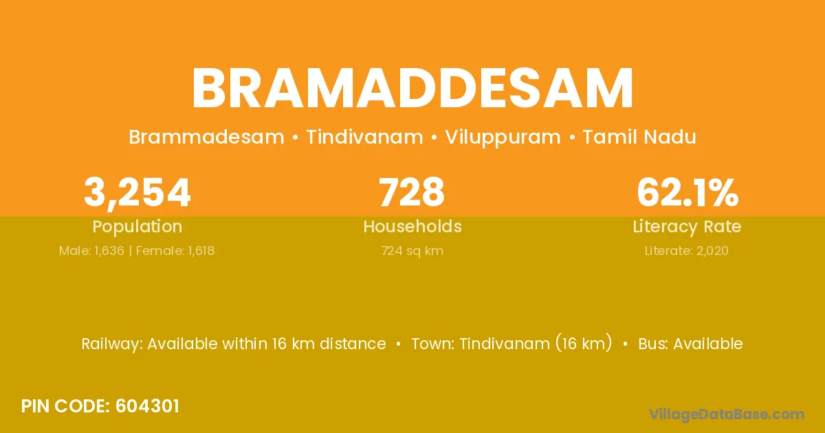 Tindivanam (16 km) is the nearest town to Bramaddesam village for major economic activities and is located approximately 16 km away.