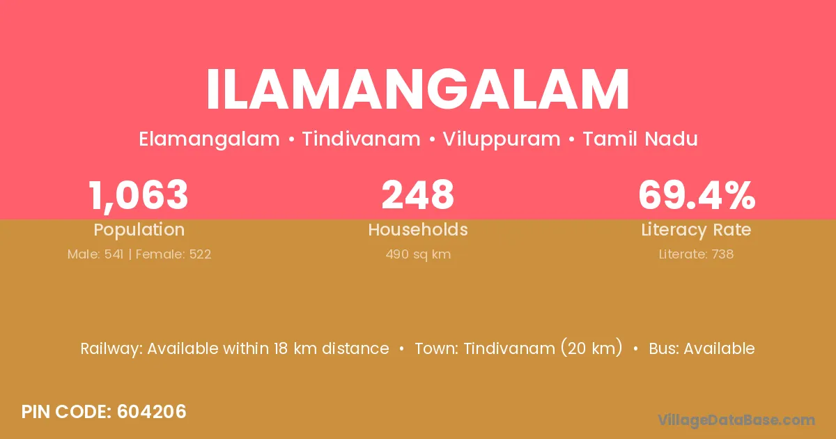 Ilamangalam village has a total population of 1,063 people, of which 541 are males and 522 are females.