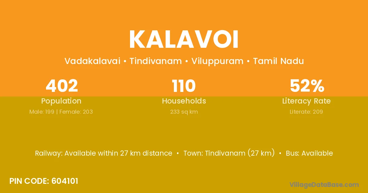 According to Census 2011 information, the village code of Kalavoi village is 604101.
