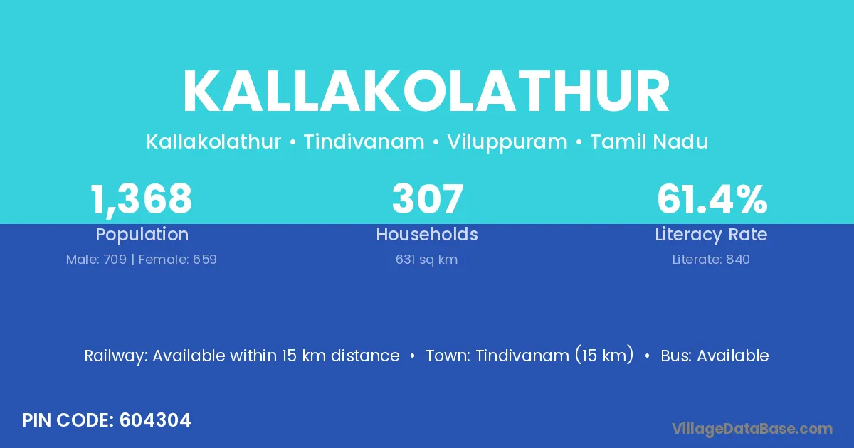 Kallakolathur village has a total population of 1,368 people, of which 709 are males and 659 are females.