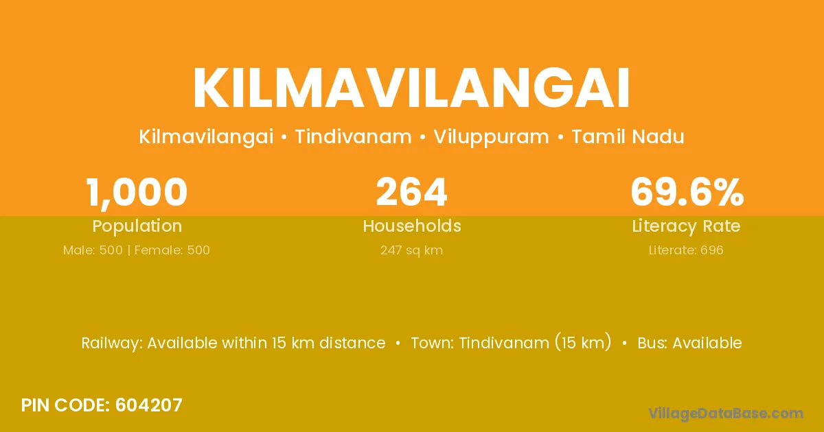 Tindivanam (15 km) is the nearest town to Kilmavilangai village for major economic activities and is located approximately 15 km away.