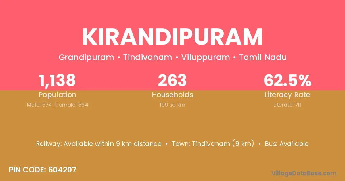 Kirandipuram village has a total population of 1,138 people, of which 574 are males and 564 are females.
