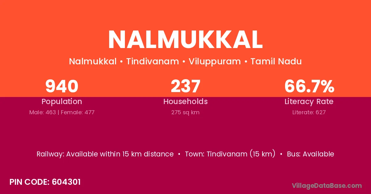 Nalmukkal village has a total population of 940 people, of which 463 are males and 477 are females.
