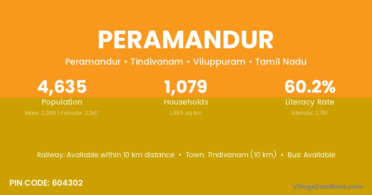 Tindivanam (10 km) is the nearest town to Peramandur village for major economic activities and is located approximately 10 km away.