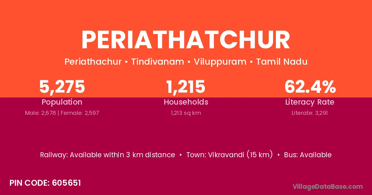 Vikravandi (15 km) is the nearest town to Periathatchur village for major economic activities and is located approximately 15 km away.