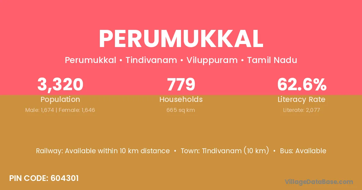 Perumukkal village has a total population of 3,320 people, of which 1,674 are males and 1,646 are females.