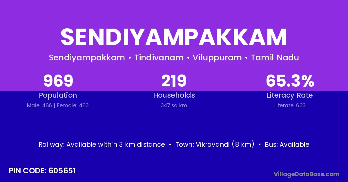 Sendiyampakkam village has a total population of 969 people, of which 486 are males and 483 are females.