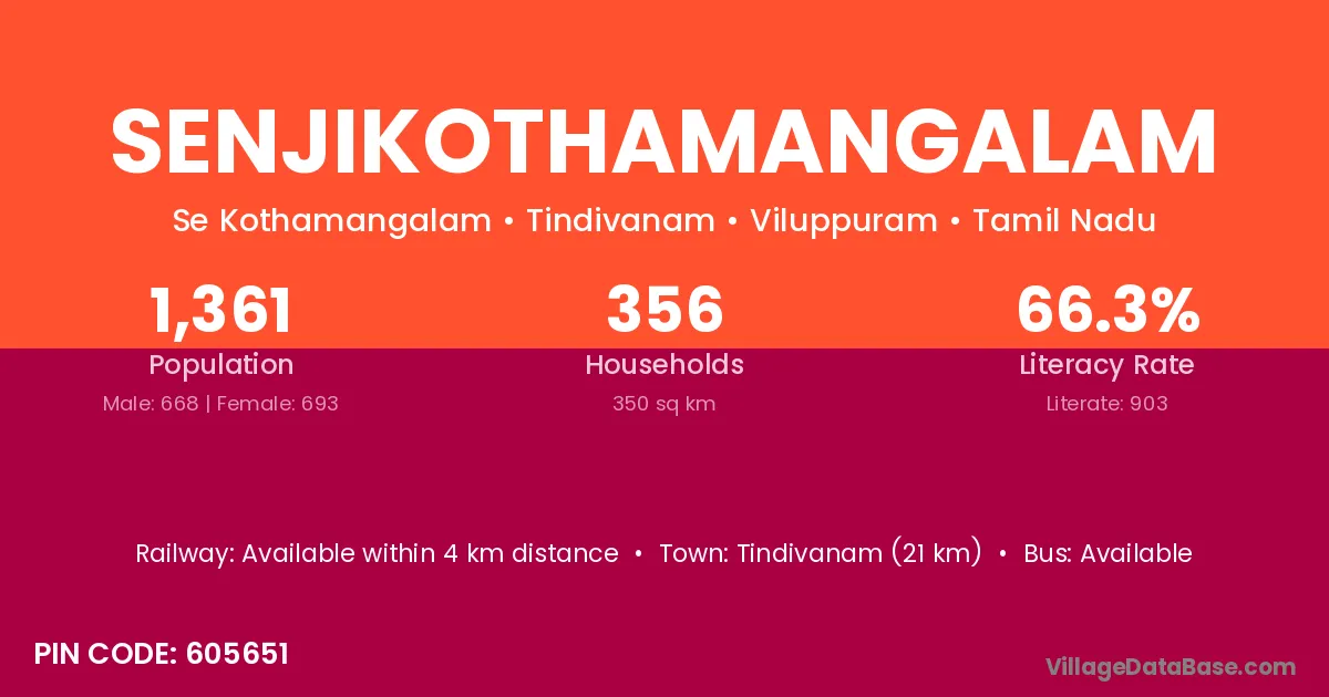 Tindivanam (21 km) is the nearest town to Senjikothamangalam village for major economic activities and is located approximately 21 km away.