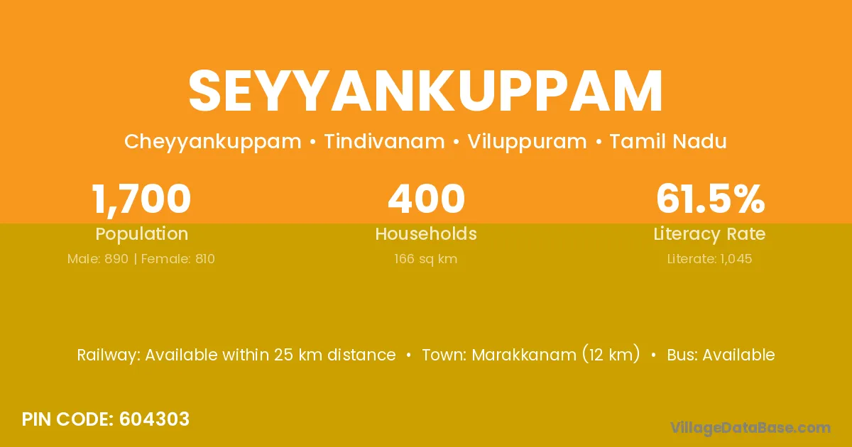Marakkanam (12 km) is the nearest town to Seyyankuppam village for major economic activities and is located approximately 12 km away.