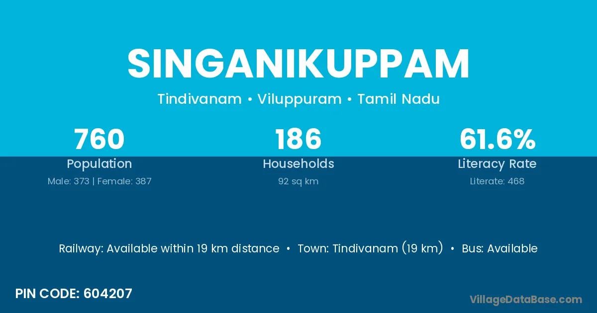 Singanikuppam village has a total population of 760 people, of which 373 are males and 387 are females.