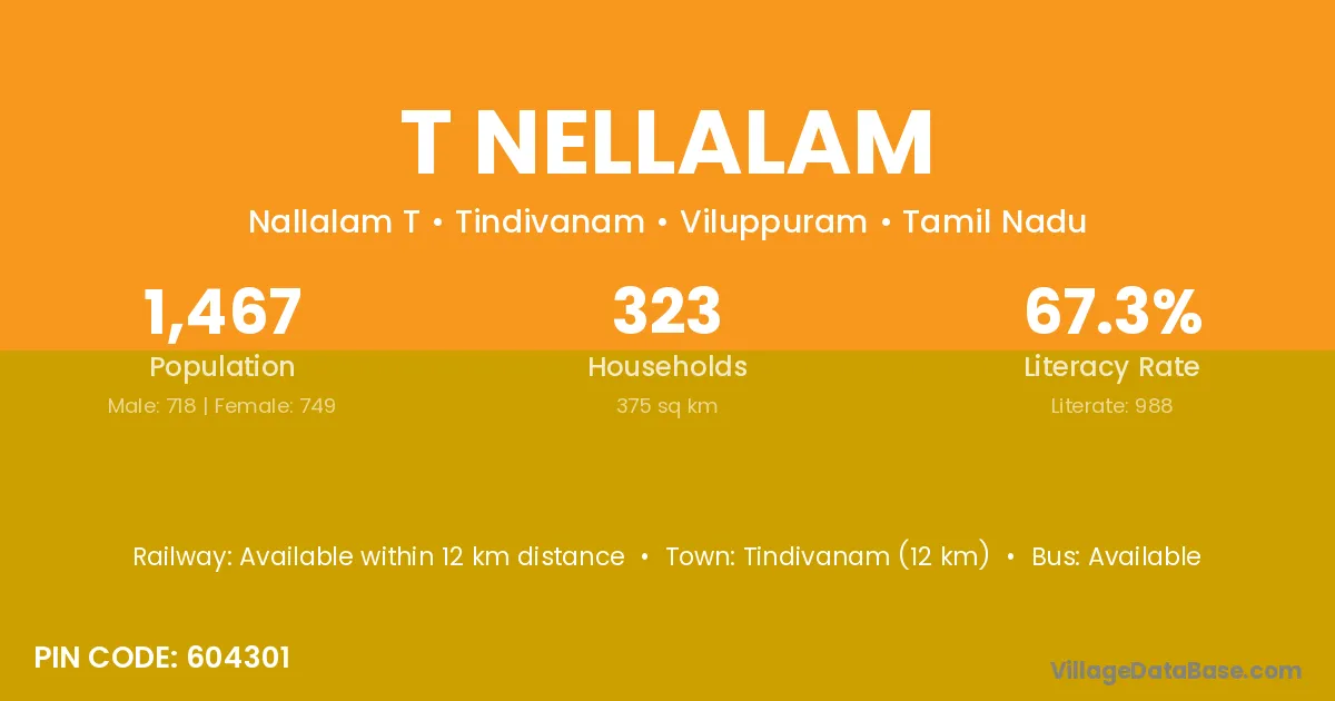 T Nellalam village has a total population of 1,467 people, of which 718 are males and 749 are females.