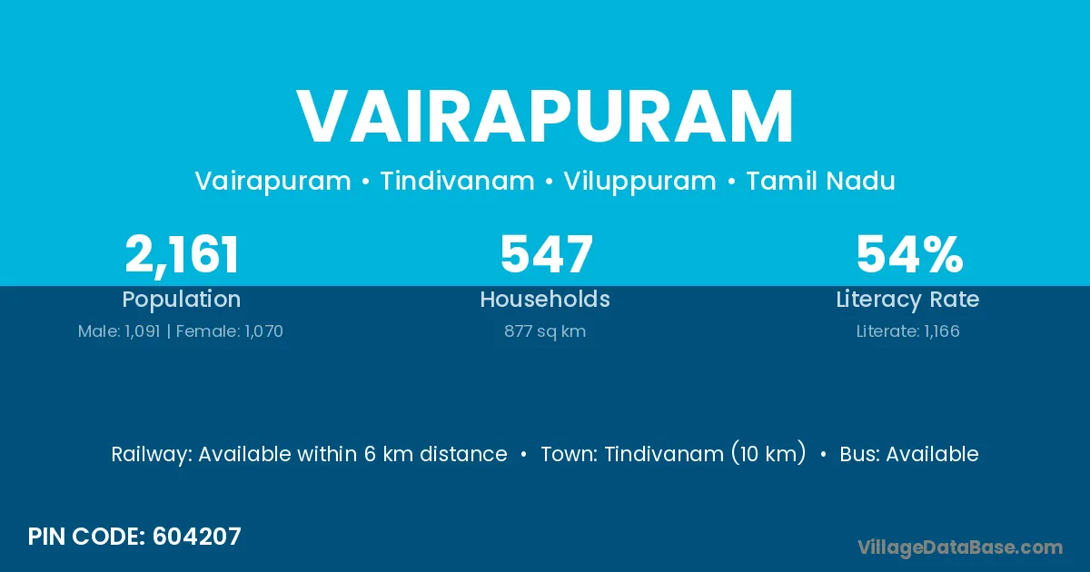 Vairapuram village has a total population of 2,161 people, of which 1,091 are males and 1,070 are females.