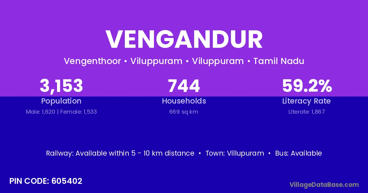 Tindivanam (16 km) is the nearest town to Vengandur village for major economic activities and is located approximately 16 km away.